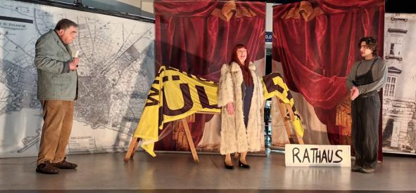 Am Dienstag, den 12.04.2022 wurde die Aula der GDRS zum Schauplatz einer tragischen Komödie. Ein Ensemble des Schultheaters "Thalia" reiste aus Wien an und führte für die Klassenstufe 9 Friedrich Dürrenmatts "Der Besuch der alten Dame" auf.